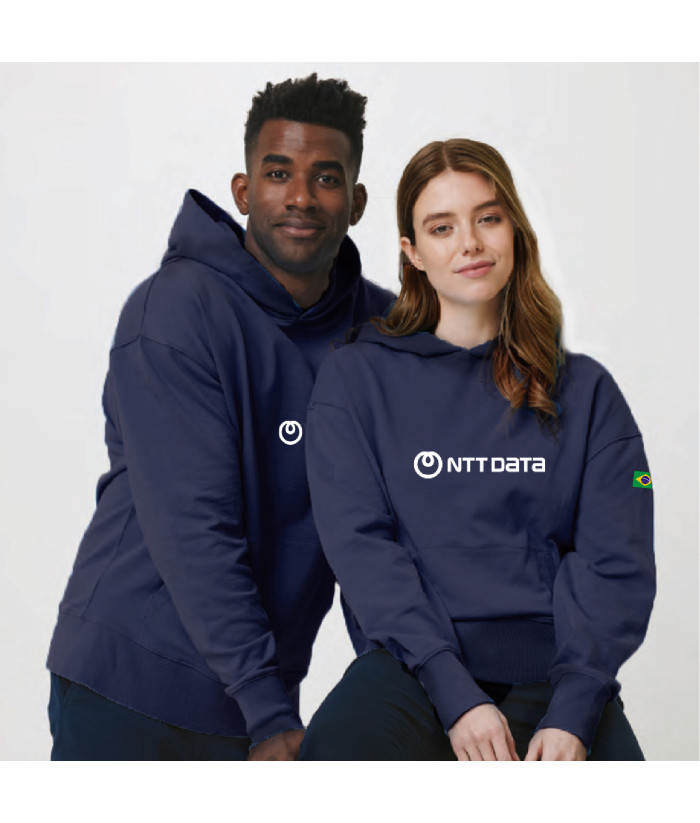 Moletom Unissex canguru com capuz. Incrivelmente macio com um corte solto e moderno. Composto de fibras de algodão e poliéster. Contém reforço de ombro a ombro, capuz e bolso. Personalizado com logo da NTTDATA novo.